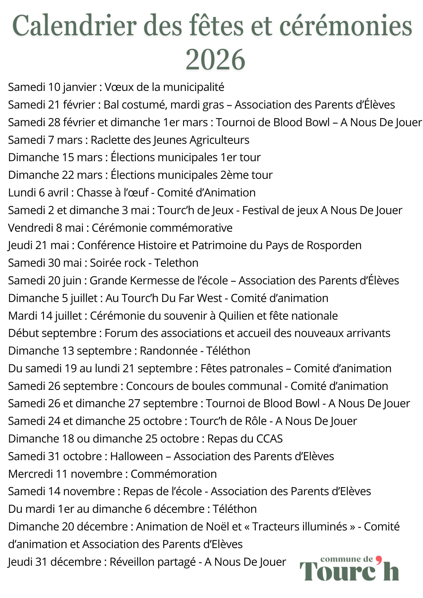 Consulter le calendrier des fêtes et cérémonies 2026 de la commune de Tourc'h